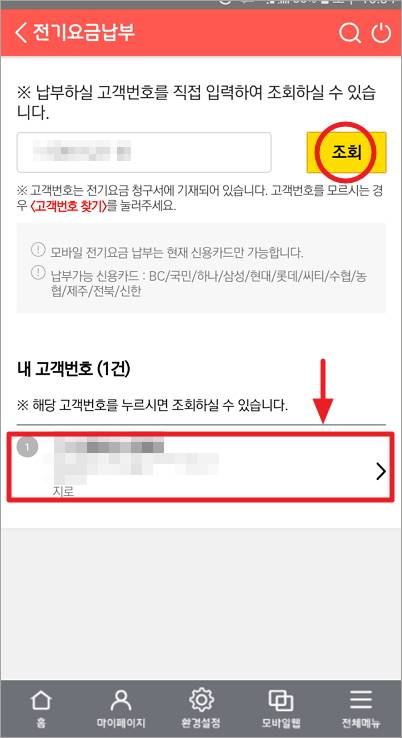 그러면 조회페이지가 나타납니다. 고객번호를 입력하고 조회버튼을 누르면 하단에 내고객번호가 나타나는데 클릭하면 결제창으로 넘어갑니다.