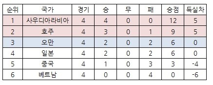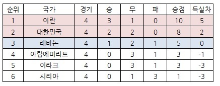 현재 4경씩 치른 결과의 순위는 다음과 같습니다.